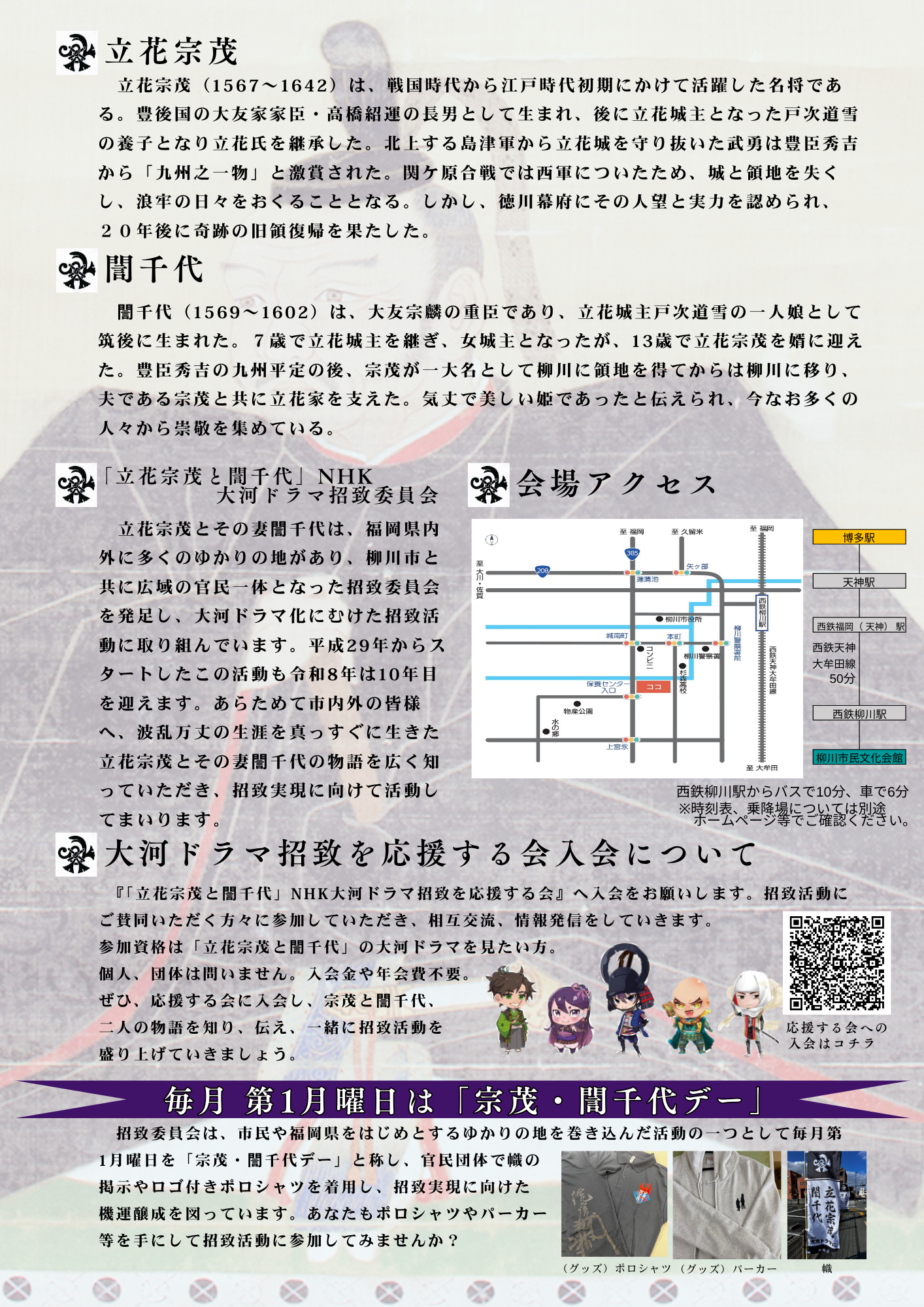 「立花宗茂と誾千代」NHK大河ドラマ招致委員会を平成29年に設立し、令和8年に招致活動開始から10年の節目を迎えるにあたって改めて招致実現の機運を高めるため、歴史講演会を開催いたします。招致委員会設立直後である平成30年にご講演いただいた本郷和人教授をお招きし、立花宗茂と誾千代の人物像や、他の武将との関わり、全国の縁の地などをご紹介いただきます。ぜひお越しください。