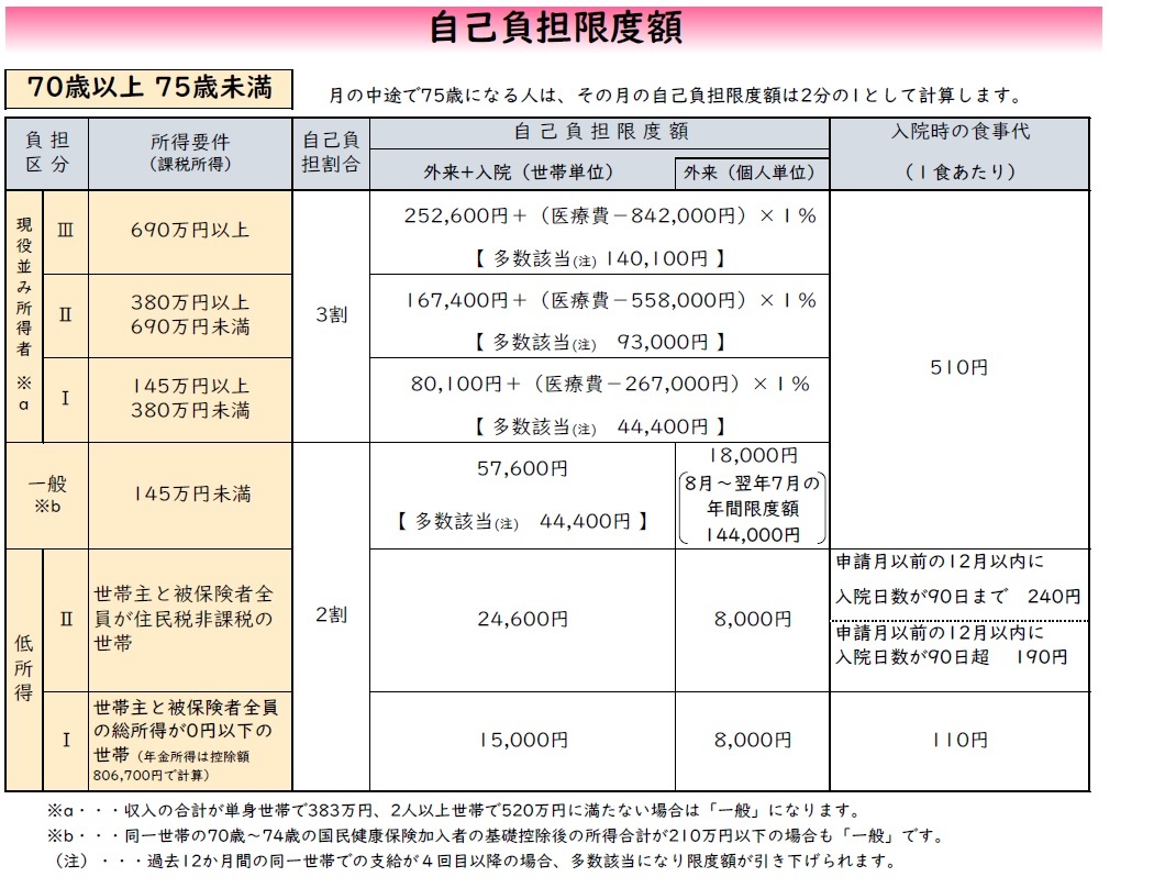 過去12ヶ月間に、同世帯で高額療養費の支給が4回以上あった場合(多数該当)は、4回目以降の限度額が引き下げられます。(ただし、70歳以上75歳未満で低所得Ⅰ、Ⅱの人は除く)