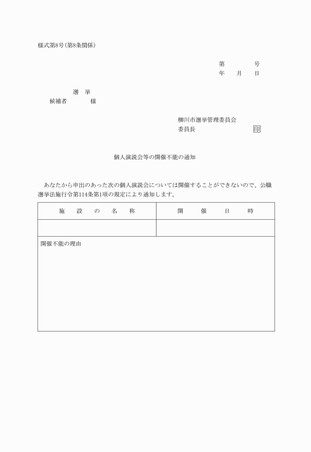 第8条 令第114条の規定により、候補者に対して行う通知は、個人演説会等の開催不能の通知(様式第8号)によるものとする。