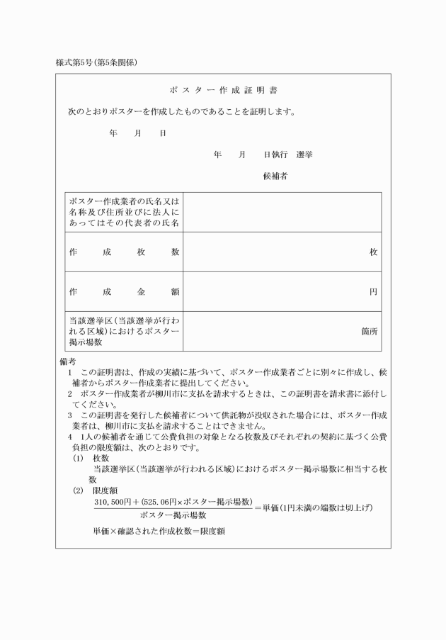 第5条 候補者は、選挙運動用自動車使用証明書又はポスター作成証明書を、使用又は作成の実績に基づき作成し、条例第3条に規定する有償契約を締結した一般乗用旅客自動車運送事業を経営する者その他の者又はポスター作成業者(以下「契約業者等」という。)に提出しなければならない。
