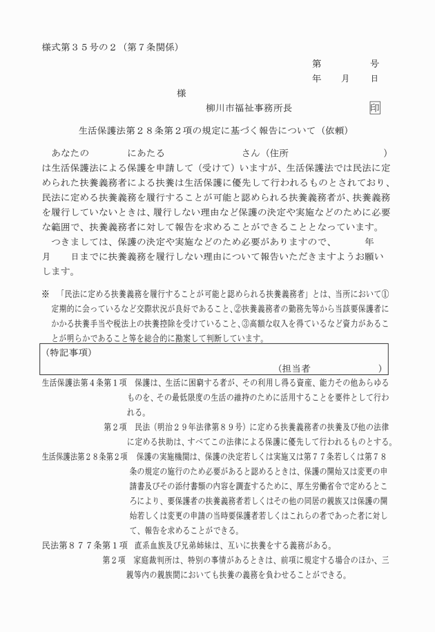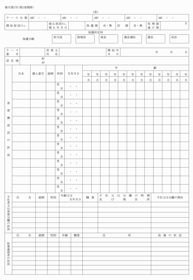 第2条 柳川市福祉事務所長(以下「所長」という。)は、被保護者につき、次に掲げる書類を作成し、常にその記載事項について整理しておかなければならない。
