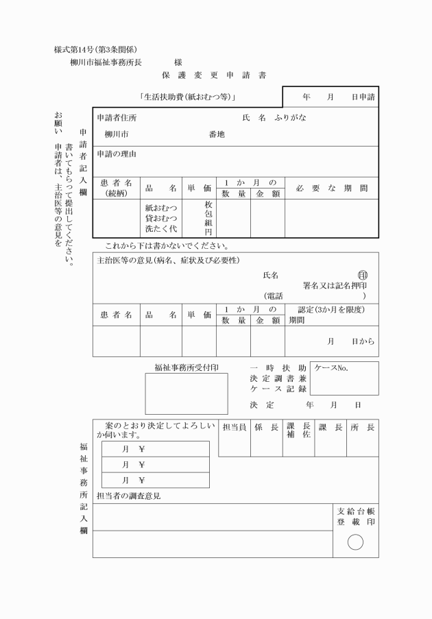 (2) 生活扶助のうち紙おむつ及び貸おむつ代等についての申請 保護変更申請書「生活扶助費(紙おむつ等)」(様式第14号)