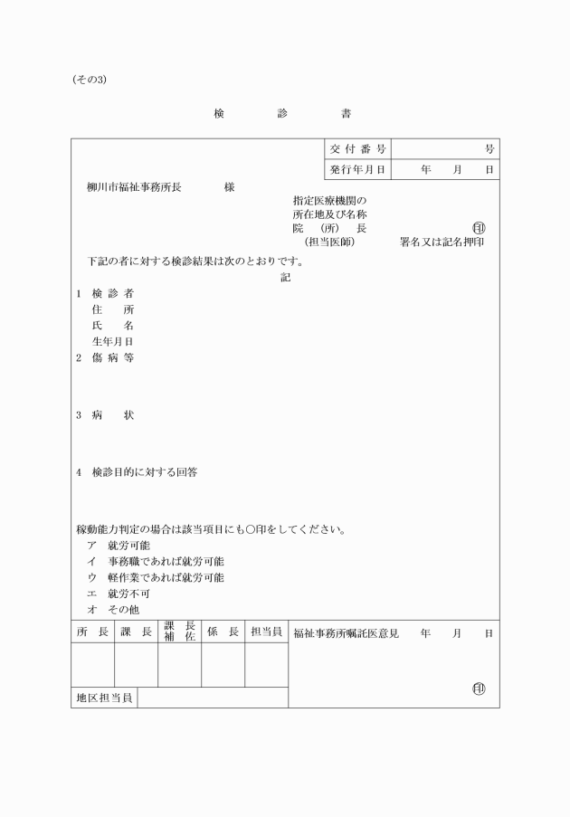 (7) 医療扶助のうち入院外の診療、治療材料、施術及び移送についての申請 保護変更申請書(傷病届)(様式第19号)