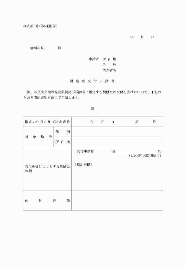 第1条 この規則は、柳川市企業立地等促進条例(平成18年柳川市条例第33号。以下「条例」という。)の施行に関し必要な事項を定めるものとする。