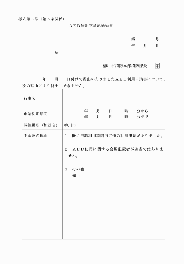 2 消防本部消防課救急係にAED貸出書(様式第4号)を備えるものとする。