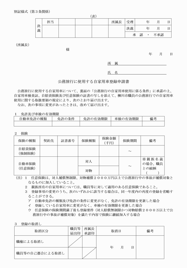 3 職員等が自己都合による自家用車の登録を取り消す場合は、申請書の職員等届出印欄に押印の上、取消日を記載し所属長に提出しなければならない。この場合において、所属長の承認は不要とする。
