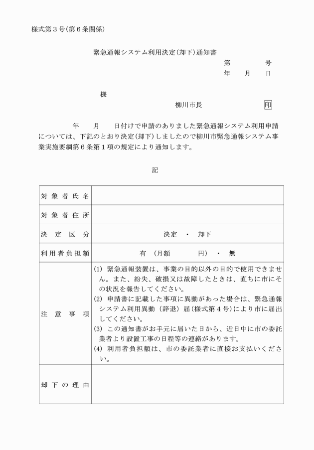 2 市長は、前項の規定により緊急通報システム利用の決定を受けた者(以下「利用者」という。)について、必要な事項を事業者に通知し、装置を設置するものとする。