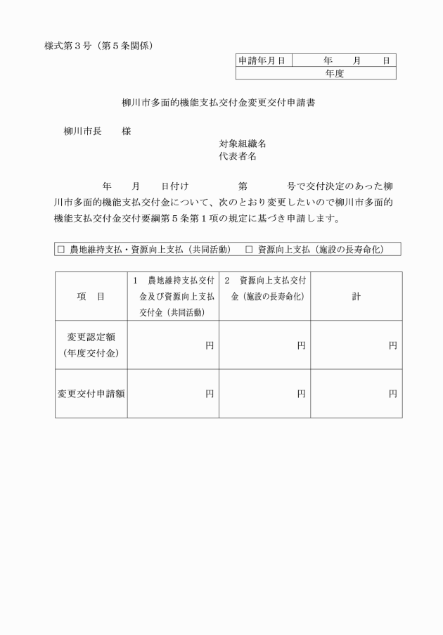 第3条 交付金の申請をする対象組織は、市長が毎年度別に定める日までに、柳川市多面的機能支払交付金交付申請書(様式第1号)を市長に提出しなければならない。