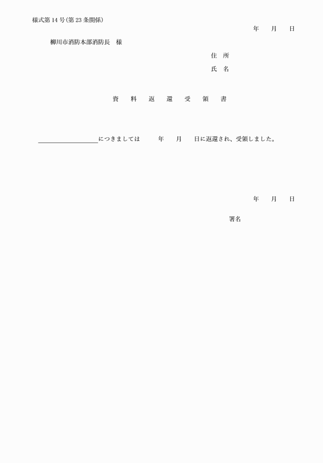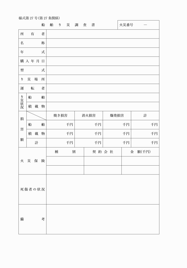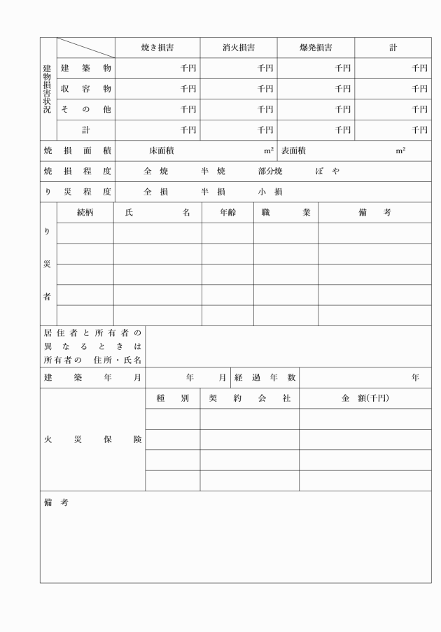 第31条 消防長は、損害調査の資料として、り災者から火災の鎮火後速やかに、建築物損害調査書、林野り災調査書、車両り災調査書、船舶り災調査書、航空機り災調査書、その他のり災調査書、収容物損害調査書、又はり災届出書を火災の種類に応じて提出を求めておかなければならない。
