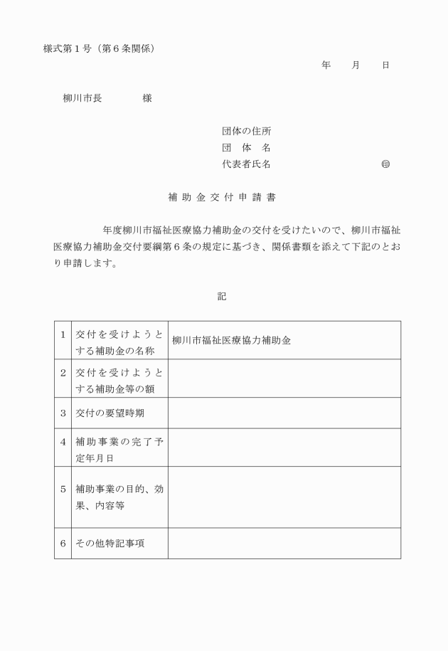 第1条 この告示は、本市の地域医療の充実及び住民福祉の向上に資することを目的に、主体的に事業等を実施する団体に対して、柳川市福祉医療協力補助金(以下「補助金」という。)を予算の範囲内で交付することに関し、柳川市補助金等交付規則(平成17年柳川市規則第46号)に定めるもののほか、必要な事項を定めるものとする。