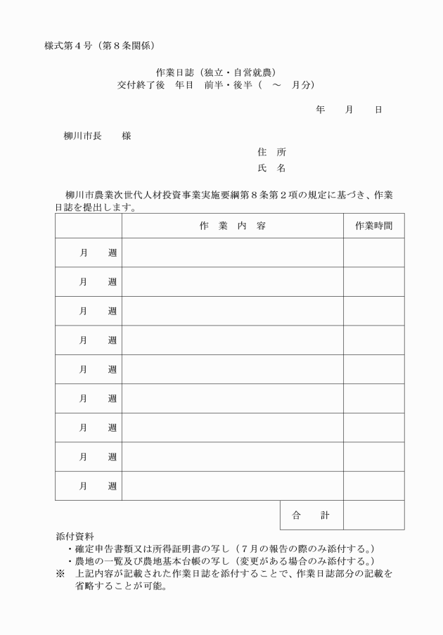 2 資金受給者は、交付期間終了後5年間、毎年7月末及び1月末までに、その直前の6か月間の作業日誌(独立・自営就農)(様式第4号)に関係書類を添えて、市長に提出しなければならない。