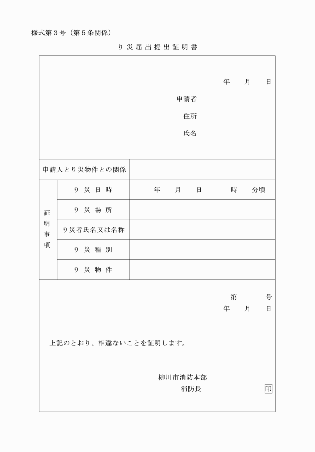 イ 個々の物件等で焼損等の確認が困難なものについて、当該物件のり災届出書が提出されていることを明らかにする場合は、り災届出提出証明書(様式第3号)