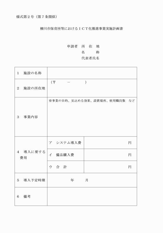 (1) 柳川市保育所等におけるICT化推進事業実施計画書(様式第2号)